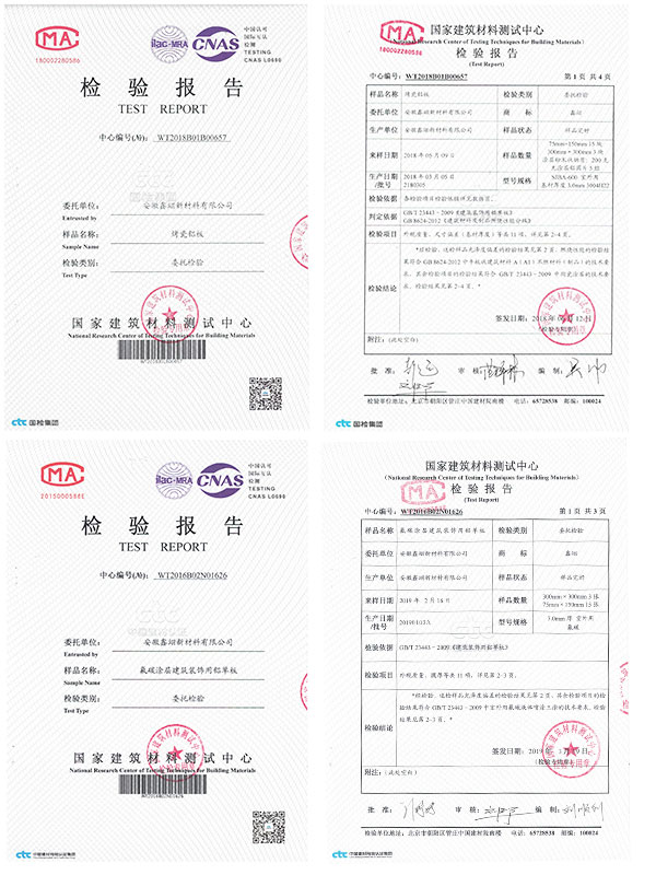 烤瓷鋁板的性能通過(guò)國(guó)家建筑材料質(zhì)量監(jiān)督檢驗(yàn)中心檢測(cè),按國(guó)家標(biāo)準(zhǔn)GB/T23443-2009《建筑裝飾用鋁單板》的標(biāo)淮得出的數(shù)據(jù),所有的指標(biāo)都是合格,特別其硬度達(dá)到6H以上。防火性能通過(guò)國(guó)家防火建筑材料質(zhì)量監(jiān)督檢驗(yàn)中心檢測(cè),按國(guó)家標(biāo)準(zhǔn)BB/T8624-2006《建筑材料及制品燃燒性能分級(jí)》的標(biāo)準(zhǔn)得出數(shù)據(jù),其防火性能A1級(jí)。