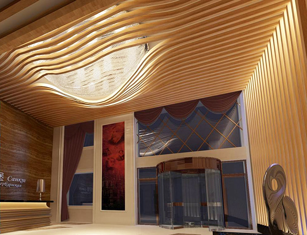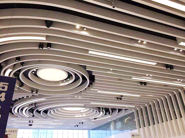 弧形鋁方通吊頂?shù)脑O計,有基本的兩點要求,一個是底寬的要求,另一個是厚度的基本要求。兩者都是因為加工工藝的限制從而受到限制,波浪造型鋁方通吊頂?shù)牡讓挘话憬ㄗh在30mm以上,小30mm,因為波浪造型鋁方通吊頂,是通過電焊固定成型的,電焊的過程中,需要保證整個鋁方通的平直度,如果底寬太小,電焊加工的過程中很容易造成歪曲,從而影響整根鋁方通的效果,其次,厚度的基本要求,是因為波浪造型鋁方通吊頂燒焊加工而成,燒焊的焊點比較多,溫度較高,如果是太薄的板子,一燒焊就穿了,這樣自然是加工不了的,因而波浪造型鋁方通吊頂厚度要求在2.0mm以上